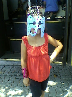 Como num passe de mágica, após algumas orientações, recortes e colagens, surgem os belos resultados. Mamãe e filha, mais acima, e outra criança, ao lado de Luana, expõem as máscaras que fizeram...